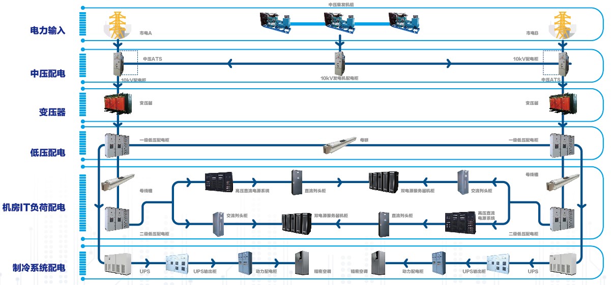 白云電器提供從硬件設備到監控軟件,從中壓到低壓的全系統產品,包括:40.5kV開關設備、12kV開關設備、變壓器、智能低壓配電設備、可視化母線槽、精密列頭柜、PSCADA及能源管理系統等,豐富、優質的產品是數據中心綠色、可靠的有效保證。同時,根據客戶的實際需求,提供完整、多樣化、定制的供配電系統解決方案,從而為數據中心的安全、穩定、高效運行保駕保航。