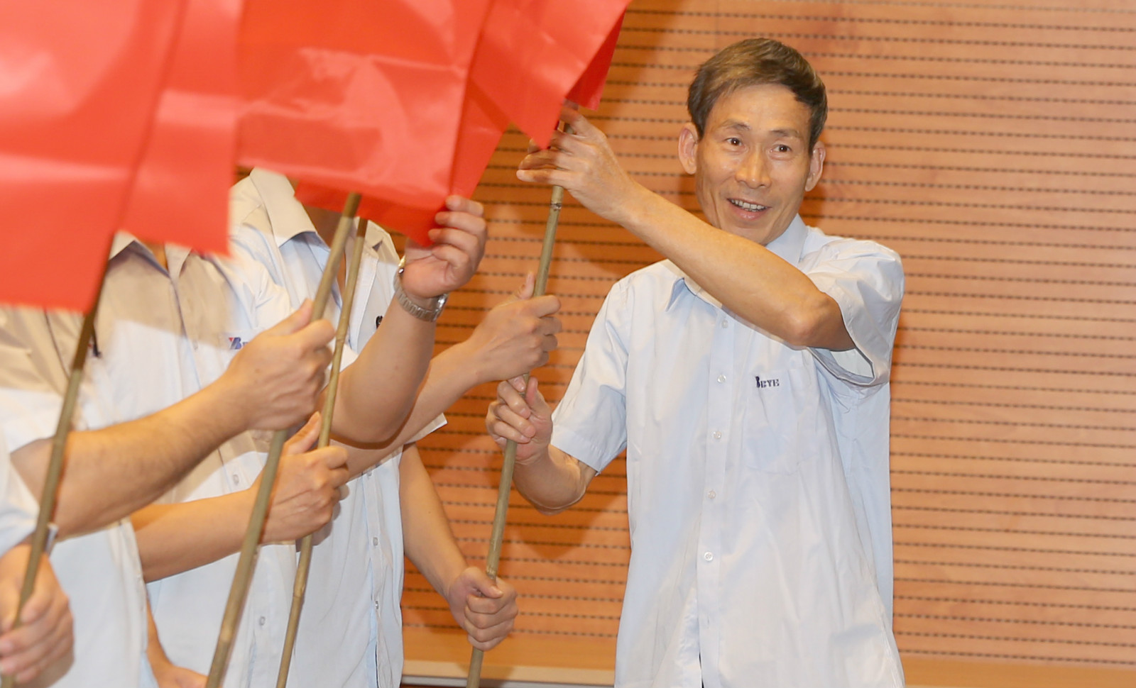 胡明聰總裁將十二面鮮紅的隊旗熱情而有力地授予十二支隊伍的代表,這不僅僅是一面代表榮譽和責任的旗幟,更是一面滿含期望與囑托的旗幟,是一代又一代白云人的傳承與發(fā)展的旗幟!十二支隊伍接過沉甸甸的隊旗后立即開始了認真而又熱烈的團隊文化創(chuàng)作,似乎想用自己精心創(chuàng)作的隊名回應(yīng)總裁的鼓勵與期許,“榮耀隊”、“降龍隊”、“人人爭先隊”……綻放出一線管理者們意氣風發(fā)、朝氣蓬勃的風采。全場起立,莊嚴的國歌聲將整場的氛圍推向高潮,“前進、前進、前進進……”氣勢磅礴的樂曲再次點燃了每個人銳意進取的奮斗精神!